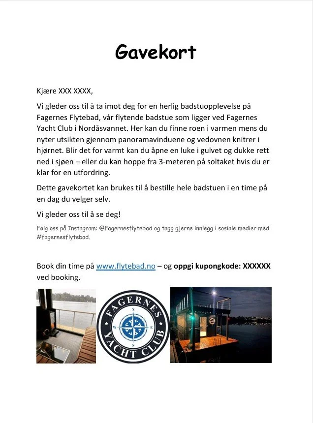 Når du bestiller et gavekort på Fagernes Flytebad gjør vi det veldig enkelt for deg! Ved bestilling legger du inn: